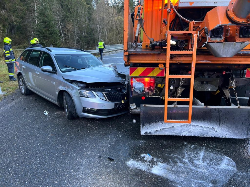 Ein PKW geriet ins Schleudern, prallte gegen die Leitschiene und anschließend gegen einen Streuwagen.